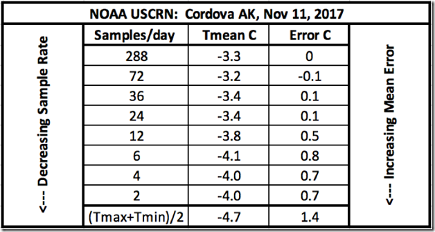 Aus der Tabelle geht klar hervor, dass bei Reduktion der Anzahl der Messwerte unter Nyquist der daraus erwachsende korrespondierende Fehler infolge des Aliasing zunimmt. Auch zeigt sich eindeutig, dass 2, 4, 6 oder 12 Messwerte pro Tag ein sehr ungenaues Ergebnis zeitigen. Eine Anzahl von 24 Messungen pro Tag (also stündlich) bis zu 72 Messwerten pro Tag (3 Messwerte innerhalb von 1 Stunde) kann genaue Ergebnisse erzielen – oder auch nicht. Die NOAA hat sich für 288 Messwerte pro Tag entschieden (4320 Messwerte pro Tag vor der Mittelbildung). Also wird das jetzt als der gegenwärtige Grund-Standard angesehen. Eine Anzahl von Messwerten unter 288 pro Tag wird (und sollte auch) als eine Verletzung des Nyquist-Theorems angesehen werden.