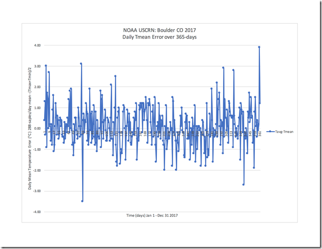 Abbildung 4 zeigt den täglichen mittleren Fehler zwischen dem Verfahren mit 288 Werten pro Tag nach USCRN und dem historischen Verfahren, wie er über 365 Tage an der Station Boulder in Colorado im Jahre 2017 gemessen worden war. Jeder Datenpunkt ist der Fehler jedes einzelnen Tages in der Aufzeichnung. Man erkennt aus Abbildung 4, dass (Tmax + Tmin )/2 tägliche Fehler bis zu ± 4 °C erzeugt. Die Berechnung eines Mittelwertes mit nur zwei Werten pro Tag ergibt kaum jemals den korrekten Mittelwert.