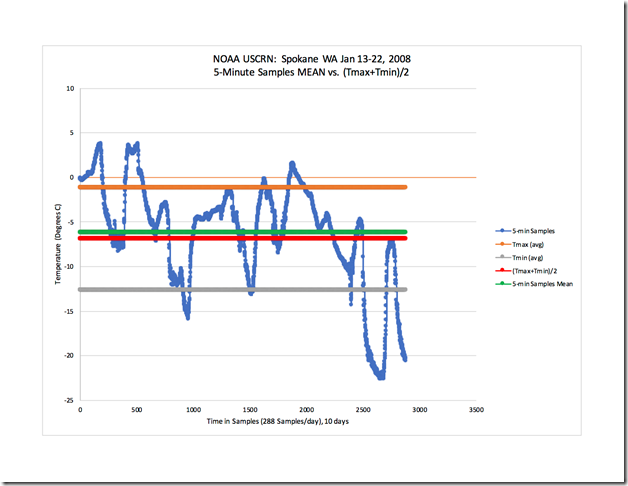 Betrachten wir noch ein weiteres Beispiel ähnlich dem in Abbildung 1 gezeigten, aber über einen längeren Zeitraum. Abbildung 5 zeigt (in blau) das 288 Werte pro Tag-Signal aus Spokane, WA [= Washington State, am Pazifik] vom 13. bis zum 22. Januar 2008. Tmax (mittel) und Tmin (mittel) sind jeweils in orange bzw. grau gezeigt. Das Mittel aus (Tmax + Tmin )/2 ist in rot dargestellt (-6,9°C) und das korrekte Mittel aus den alle 5 Minuten gemessenen Werten ist in grün dargestellt (-6,2°C). Das Mittel aus (Tmax + Tmin )/2 weist einen Fehler von 0,7°C über die 10-Tage-Periode auf.