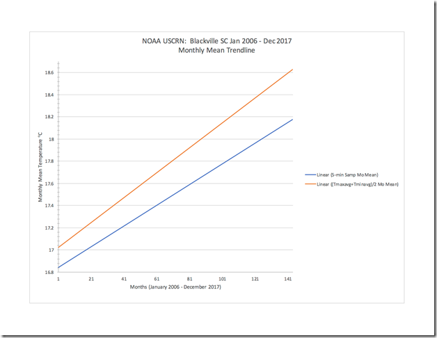 Abbildung 6: NOAA USCRN-Daten für Blackville, SC von Januar 2006 bis Dezember 2017 – monatliche Mittel-Trendlinien