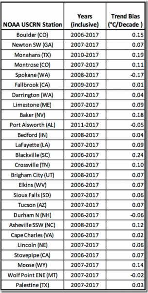 Obwohl man keine Schlussfolgerungen ziehen kann, wenn man die Trends über 7 bis 12 Jahre an 26 Stationen im USCRN vergleicht mit den gegenwärtig anerkannten lang- oder kurzzeitigen globalen Mitteltemperatur-Trends, kann dieser Vergleich instruktiv sein. Klar ist, dass die Anwendung des historischen Verfahrens zur Berechnung von Trends einen Trend-Fehler ergibt und dass dieser Fehler von ähnlicher Größenordnung sein kann wie die geltend gemachten Trends. Daher ist es vernünftig, die Validität der Trends zu hinterfragen. Es gibt keine Möglichkeit, diese Validität sicher herauszufinden, weil es bzgl. des Großteils der instrumentellen Aufzeichnung keine ordentlich errechnete Aufzeichnung zum Vergleich gibt. Aber mathematisch sicher ist, dass jede Mitteltemperatur und jeder Trend in den Aufzeichnungen signifikante Fehler enthält, falls das Verfahren der 2 Werte pro Tag angewendet worden ist.