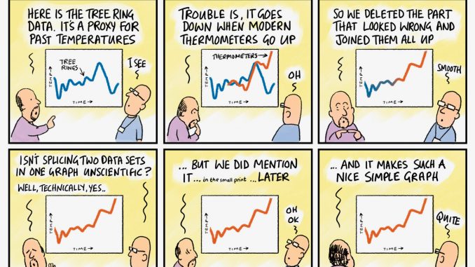 Josh 2019. Übersetzung der Bildinschriften oben [von links nach rechts, obere Zeile]: „Hier sind die Baumring-Daten. Sie sind ein Proxy für Temperaturen der Vergangenheit“ – „Das Problem ist, sie zeigen einen Abwärtstrend, wenn moderne Thermometer einen Aufwärtstrend zeigen“ – „Also löschten wir den falsch aussehenden Teil und fügten dann alles zusammen“ – [untere Zeile]: „Ist es nicht unwissenschaftlich, zwei Datensätze einfach zusammen zu fügen?“ – „Nun, technisch ja“ – „Aber wir haben es im Kleingedruckten später erwähnt…“ – „…und damit erhalten wir so eine wunderbare Graphik“