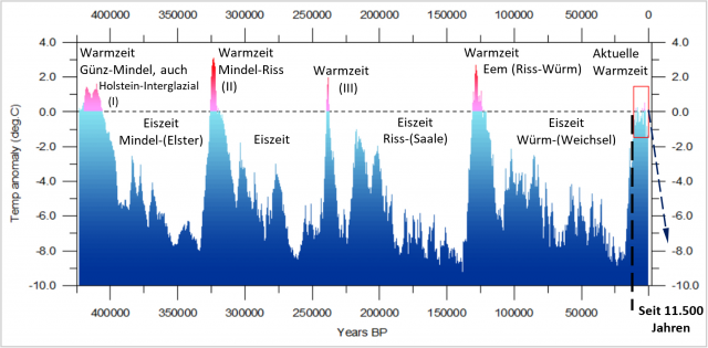 Bild 8 [18] Eiszeiten der letzten 1 Millionen Jahre. Die rote Linie kennzeichnet die aktuelle Temperatur