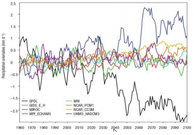 Bild 9 Darstellung aus der Studie mit den Ergebnissen verschiedener Projektions-Testläufe. [16] Figure 1.7: The JAS-mean Sahel rainfall anomalies from CMIP3 models. This figure is from Cook 2008 (‘News & Views’ in Nature).