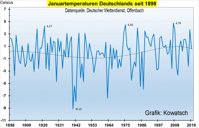 Wir fragen uns natürlich, wo sich dieser Januar 2019 im langen Geschehen Deutschlands einreiht und wie sich der Monat über einen längeren Zeitraum entwickelt hat. Aus unseren Vorartikeln über die anderen Monate weiß der Leser bereits, dass die Temperatur Deutschlands im letzten Jahrhundert in Form einer sinusähnlichen Schwingung verläuft mit Wellenbergen und Wellentälern. Wir wählen als Betrachtungszeitraum die letzten 120 Jahre, weil in der zweiten Hälfte des 18. Jahrhunderts die Kleine Eiszeit erst zu Ende ging und sich das heutige Temperaturniveau in Mitteleuropa einstellte. Einzuwenden wäre natürlich, dass um 1900 ein ganz anderes Deutschland mit anderen Grenzen bestand und die Wetterstationen an ganz anderen Plätzen mit ganz anderen, nämlich viel kälteren Umgebungsbedingungen standen wie heute. Beim Monat Januar ergeben die vom Deutschen Wetterdienst aneinandergereihten jährlichen Durchschnitte so aus: