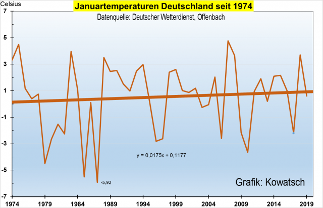 Man kann aber auch feststellen: Seit 1974 hat sich laut linearer Trendlinie der Januar nicht mehr signifikant erwärmt. Trotz intensiver Kohlendioxidzunahme in diesen viereinhalb Jahrzehnten hat das angebliche Treibhausgas CO2 in Deutschland keine Erwärmung mehr bewirkt. Eine Tatsache, die einmal mehr zeigt, dass dieses für das Leben auf der Erde notwendige und saubere Gas kaum oder nichts erwärmen kann. Auch misslingt jeder Nachweisversuch. Der Januar 2019 war zudem leicht unter der Trendlinie.