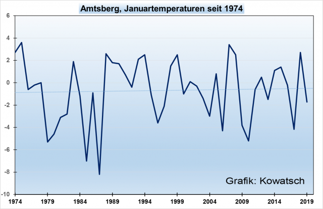 Ergebnis: Der Januar zeigt in Amtsberg am Fuße des Erzgebirges keinerlei Erwärmung und ganz außerhalb der Ansiedlung, also in der freien unbebauten Landschaft bestimmt auch nicht. Seit 1974 hält der Januar trotz CO2-Zunahme in Deutschland sein Niveau.