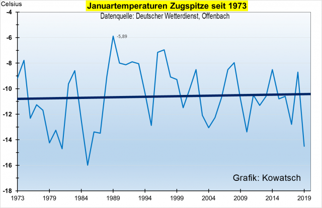 Selbst auf der Zugspitze wurde der Januar nicht wärmer, obwohl auf Deutschlands höchstem Berg die Bebauung und der Tourismus in diesem Zeitraum wesentlich zugenommen haben. Aber unabhängig davon auch der Kohlendioxidanteil in der Atmosphäre. Das Thermometer der Wetterstation lässt sich davon nicht beeinflussen.