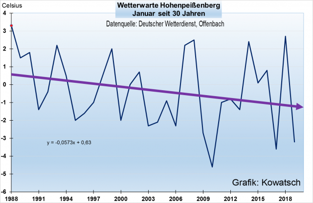 Ergebnis: Die Januartemperaturen des Deutschen Wetterdienstes zeigen in den letzten 30 Jahren eine leichte Abkühlung und das trotz weiter zunehmender CO2-Konzentrationen überall auf der Welt. Abkühlung ist das Gegenteil von Erwärmung. Ob der Abkühlungstrend sich fortsetzen wird? Wir wagen keine Prognose. Aber: Ein Wonnemonat Januar oder gar eine bevorstehende Erwärmungskatastrophe mitten im Winter ist überhaupt nicht in Sicht. Die Trendlinie lässt eher gegenteiliges vermuten. Das Klimamonitoring des DWD zusammen mit den zwei Umweltministerien Bayerns und Baden-Württembergs im Herbst 2016 war ein Treffen der Märchenerzähler, genauso wie das Falschorakel eines Mojib Latif, dass Deutschland keine Winter mehr erleben wird. Oft argumentiert die meist nicht naturwissenschaftlich ausgebildete Führungsriege des DWD gegen die eigenen Daten. Wie lange werden sich das die Fachleute in der 2.ten Reihe des DWD und all die Stationsleiter außerhalb der Städte noch gefallen lassen müssen? Wohl alle der weit über 2000 Wetterstationen in Deutschland dürften einen mehr oder weniger fallenden Trend seit 1988 haben. Als Beispiel wählen wir den Hohenpeißenberg aus.