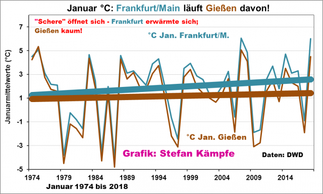 Grafik 7: Die WI-ärmere Station Gießen erwärmte sich seit 45 Jahren im Januar kaum; Frankfurt/Main hingegen merklich. Die Qualität der DWD-Daten ist jedoch oft so mangelhaft (Stationsverlagerungen, Wechsel der Messverfahren), dass die Ergebnisse nur bedingt interpretiert werden können. WI-Effekte sind außerdem sehr verschieden; sie hängen stark von Großwetterlage, Besonnung und eventuellen Stau- oder Föhneffekten ab; tendenziell sind sie bei klarem, windschwachem Wetter am stärksten.