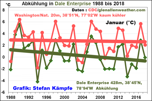 Ist vielleicht Deutschland eine Ausnahme oder gar ein Sonderfall? Wird nur bei uns der Januar kälter? Wir werfen einen Blick in die USA, zur Dale-Enterprise Weather Station in Virginia, der ältesten Wetterstation in diesem Bundesstaat. Die Station hat den Vorteil, dass sie noch ländlicher und noch einen Tick wärmeinselärmer ist als deutsche Stationen. Das Wetterhäuschen steht unverändert bei einer einsamen Farm.