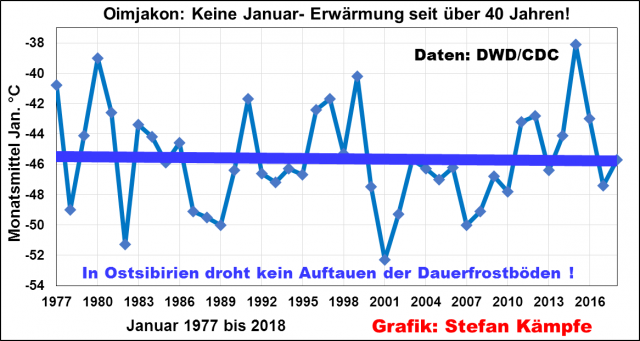 Grafik 9: Keinerlei Januar-Erwärmung im kältesten, dauerhaft normal besiedelten Ort der Welt, Oimjakon/Ostsibirien.
