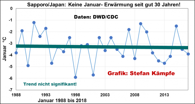 Virginia befindet sich in einer zwar auch gemäßigten, aber zu viel stärkeren Schwankungen neigenden Klimazone als Deutschland, zwar ist der Januar dort ähnlich kalt im Durchschnitt wie bei uns, aber die einzelnen Jahre entsprechen sich nicht. So war der Januar 2017 in Deutschland kalt und in Virginia eher warm. Umso erstaunlicher ist der gleichartig fallende Trendlinienverlauf über die jüngste Klimavergleichseinheit. Auch in Ostasien finden sich immer wieder Stationen ohne Januar-Erwärmung; abschließend zwei Beispiele aus Ostasien: