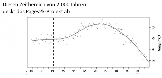 Nach einer Revision des 2k-Projektes sieht dessen Temperaturverlauf inzwischen wie im Bild 2.1 aus. Der berüchtigte – bei Herrn Rahmstorf weiterhin dargestellte – „Hockeystick“ ist darin verschwunden, weil nun die mittelalterliche Warmzeit vor dem Jahr 1000 mit enthalten ist.