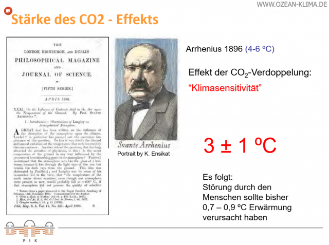 Zur Klimasensitivität werden im Foliensatz auch keine neueren Untersuchungen gelistet. Obwohl inzwischen ziemlich sicher ist, dass die vom IPCC angegebenen, 3 Kelvin/CO2-Verdopplung stark überhöht sind und der wahre Wert eher in der Größenordnung von ca. 1 Kelvin liegt, wenn nicht noch niedriger bei ca. 0,6 K, wird der 3 Kelvin Wert im Foliensatz ohne jeglichen Hinweis auf die Größenproblematik angegeben. Dass Arrhenius damals auf einen möglichst hohen Wert hoffte, weil er daraus die Erlösung von der zermürbenden Kälte der nachmittelalterlichen, „kleinen Eiszeit“ sah, wird auch nicht informiert.