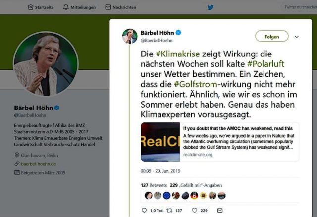 Bei so vielen Gegenstimmen zur Golfstromdarstellung von Herrn Rahmstorf konnte es nicht ausbleiben, dass sich eine der immer präsenten Expert*innen der GRÜNEN zu Wort meldet und die Sachlage „richtig“ stellt. Dass es dieses Jahr einen Winter mitten im Winter gibt, wie es früher normal war, kann ja nicht mit normalen Dingen zugehen. Nur das böse CO2 kann daran schuld sein. Und wie perfide dieses vorgeht und wie genau das Wissenschaftler (im Nachhinein) vorhersagen konnten, können nur GRÜNE (Pseudo-)Eperten in so wenigen Zeilen erklären.