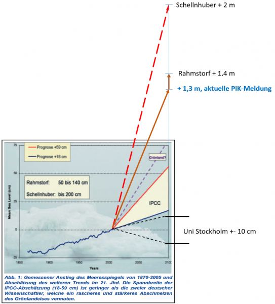 Bild 6 [7] Pegel-Zukunfts-Vermutungen zweier deutscher PIK Klimawissenschaftler und vom Rest der Welt