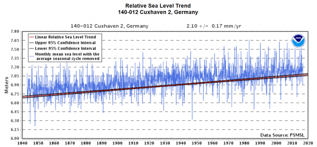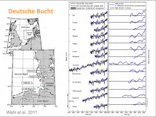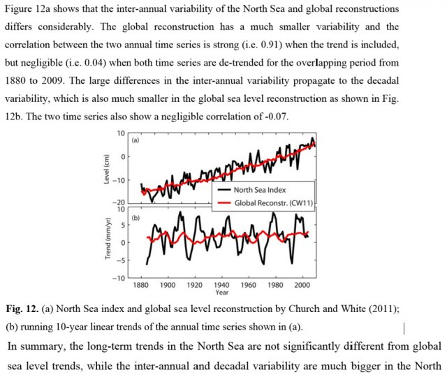 Wahl et al. 2013: … In summary, the long-term sea level trends in the North Sea are not significantly different from global sea level trends …