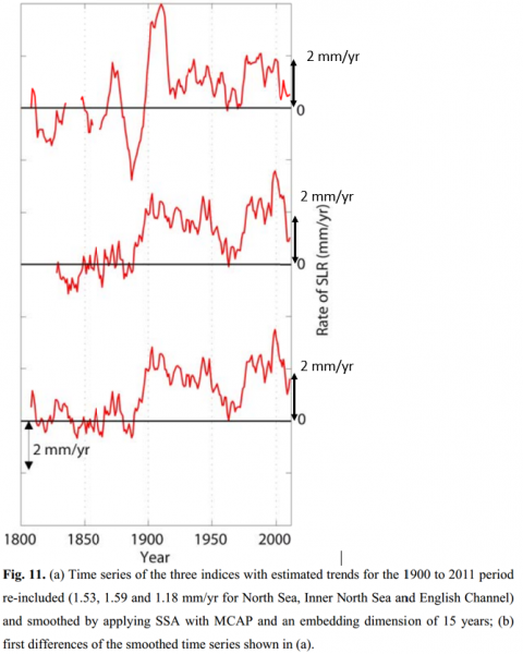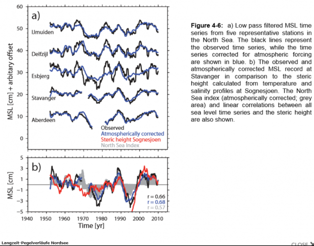 Und in dieser wird das von Professor Rahmstorf gezeigte Anstiegs-Szenario vollständig aufgehoben. Was darin schön gezeigt ist, sind die Zyklen der Nordsee-Pegeländerungen, welche es “ermöglichen”, zeitweise hohe Anstiege zu”konstruieren”, während solche in Wirklichkeit nicht existieren. Auch ist darin beschrieben, dass die Nordsee nicht schneller ansteigt als der (langsam steigende) Globalpegel