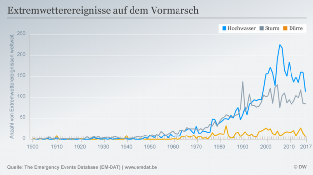 Der IPCC und Fachpublikationen sagen nein. Die Häufigkeit der meisten Extremwettertypen schwankt stark, und ein Trend ist derzeit nicht erkennbar. Die DW-Redaktion verwendet hier einen üblen Trick: Gezeigt wird nicht die Gesamtheit aller globalen Extremwetterereignisse, sondern lediglich diejenigen, die in der zitierten EM-DAT-Datenbank enthalten sind. Heute registrieren Satelliten jedes noch so kleine Ereignis. In der ersten Hälfte des 20. Jahrhunderts gibt es aber enorme Datenlücken. Nur sehr wenige Ereignisse haben es überhaupt in die Datenbank geschafft. Der schnelle Leser wird dies gar nicht bemerken, dachte man sich wohl. Eine krasse Fehldarstellung der Realität, kurz: Fake News.