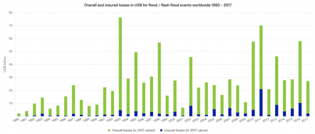 Dazu vom Autor ergänzend eine Darstellung der von Sturzfluten weltweit verursachten Kosten aus der Datenbank der MuRe: seit ca. 1990 ist keine Zunahme zu sehen. Und das trotz weltweit immer dichterer Bebauung in gefährdeten Gegenden.