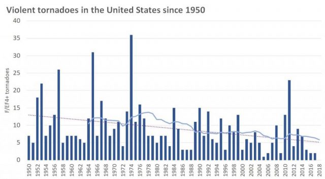 Dazu eine Grafik, die zeigt, wie schlimme Tornados in den USA trotz – oder wegen – des Klimawandels abnehmen:
