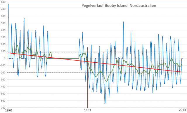 Bild 15, Pegelverlauf von Booby Island in der Torresstraße mit Langzeit-Regressionsgerade (rot) und einem gleitenden Mittelwert (grün). Grafik vom Autor anhand der PMSL-Pegeldaten erstellt