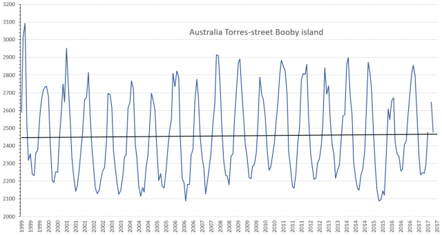 Eine aktuelle Nachschau des Pegelverlaufs in der Torres-Straße zeigt, dass sich an der damaligen Einschätzung nichts verändert hat. Dort steigt der Pegel immer noch nicht übernatürlich an, „schlimmer“, das Gegenteil ist nah: Nimmt man die Daten seit 1999, so errechnet sich ein aktueller Pegelanstieg von 0 mm/pa (Bild 18). Bei WIKIPEDIA findet sich aber immer noch die alte – schon damals falsche – Angabe.