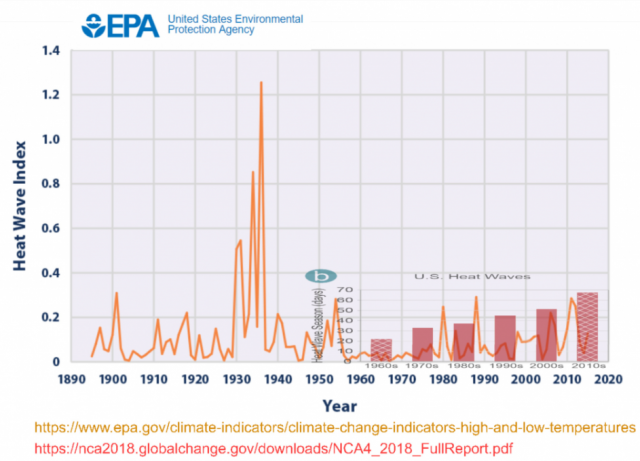 Daraus die Darstellung der Hitzewellen in den USA. Unbestritten nehmen diese steig zu.Allerdings nicht mehr, wenn man den Zeitraum seit 1900 darstellt. Dann verblassen die aktuellen und es zeigt sich die hohe, natürliche Variabilität solcher Extreme.