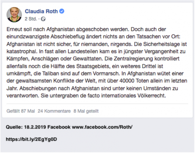 Die UN meldete für 2017 3.438 Tote [11] und für 2018 3804 Zivilisten. Auch wenn das Viele sind -so viele, wie bei uns im Straßenverkehr, wobei Afghanistan 35 Millionen, anstelle unserer 82 Millionen Einwohner hat, dabei aber 4.734 Verkehrstote (WIKIPEDIA) – und die militärischen Opfer noch dazu kommen, ist es niemals auch nur annähenrnd die von Frau Roth genannte Zahl von 40.000.