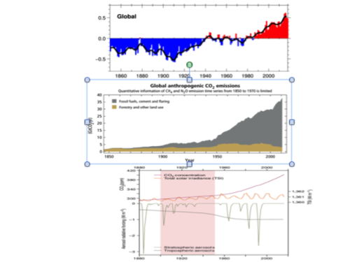 Eindeutig waren hinsichtlich der Erwärmung zu Beginn des 20. Jahrhunderts noch andere Faktoren außer CO2 im Spiel (Abb. 4.1 Mitte). Hinsichtlich externer Strahlungsantriebe würde eine Periode relativ geringer vulkanischer Aktivität im Zeitraum 1920 bis 1960 einen relativen Erwärmungseffekt haben, obwohl der Zeitraum 1945 bis 1960 Schauplatz einer leichten insgesamten Abkühlung war. Der solare Antrieb zu Beginn des 20. Jahrhunderts auf Erwärmungen unterschiedlicher Magnitude ist unklar, obwohl diese Magnituden unzureichend bzgl. eines solaren Einflusses sind, um ein direkter Haupt-Antrieb der globalen Erwärmung Anfang des 20. Jahrhunderts sein zu können.