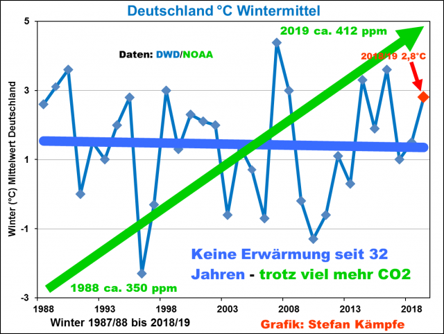 Abbildung 1: Keine winterliche Erwärmung in Deutschland seit 1987/88 – trotz deutlich steigender CO2-Konzentrationen.