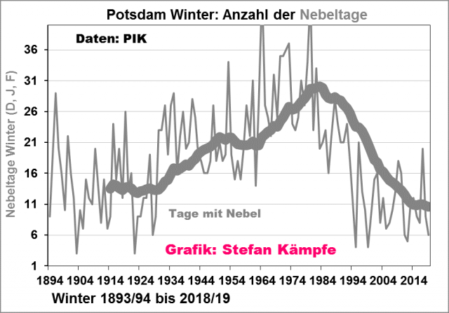 Im abgelaufenen Winter war die angeblich so schlechte Luftqualität ein Dauerthema. Messwerte hierfür (NO2, Feinstaub, SO2) liegen leider meist nur bis in die frühen 1990er oder 1980er Jahre vor. Der Winter erweist sich wegen anhaltender Inversionswetterlagen als die problematischste Jahreszeit; auch werden oft mehr Luftschadstoffe als in den übrigen Jahreszeiten emittiert (Heizungen). Einen groben Anhaltspunkt für die Entwicklung der Luftschadstoff-Konzentration bietet die Anzahl der Tage mit Nebel (Sichtweite zumindest kurzzeitig unter 1Km), weil Schadstoffe die Nebelbildung fördern. In Potsdam werden seit dem Winter 1893/94 die Nebeltage gezählt – mit erstaunlichem Ergebnis: Die Winter waren dort nie so selten neblig, wie gegenwärtig, was auf eine sehr gute Luftqualität hindeutet; auch wenn die Potsdam-Daten nur bedingt aussagefähig für ganz Deutschland sind: