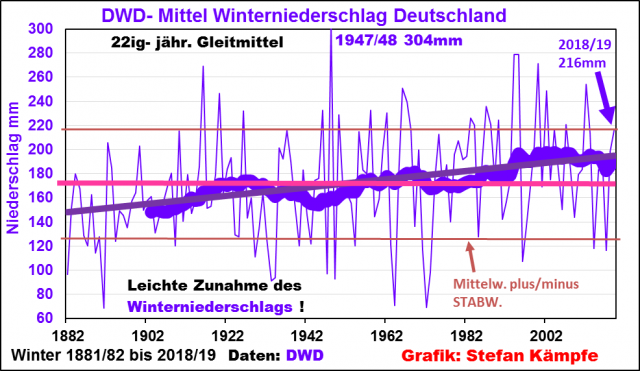 Abbildung 3: Winterliche Niederschlagszunahme in Deutschland – aber nur bis etwa 1995 (siehe Trendlinie des „gleitenden“ Mittelwertes). Der abgelaufene Winter 2018/19 überschritt mit knapp 216mm nicht einmal die einfache Standardabweichung nach oben.