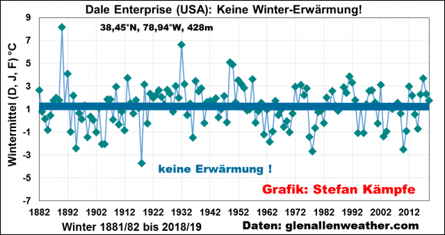 Nicht überall in den gemäßigten Breiten der Nordhalbkugel verlief dieser Winter 2018/19 so gelinde, wie in Mitteleuropa. Nordamerika bescherte er mehrere, harsche Kältewellen. An der von Wärmeinsel-Effekten wenig beeinflussten Station Dale Enterprise zeigt sich, anders als in Deutschland, auch langfristig keine Winter-Erwärmung:
