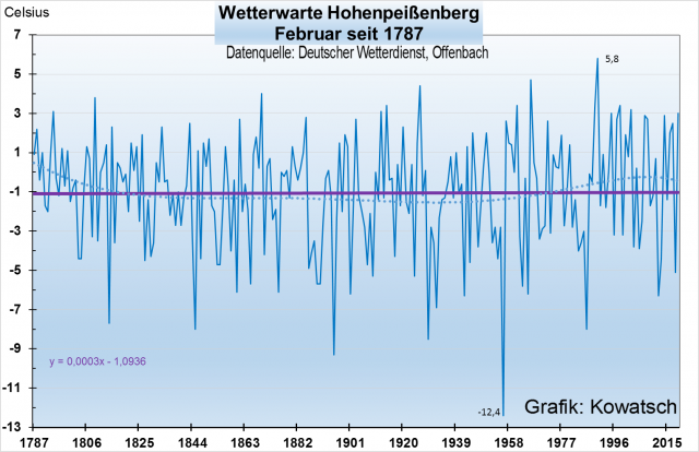 Grafik 1: Seit 1787, also seit Mozarts Zeiten haben sich die Februartemperaturen auf dem Hohenpeißenberg kaum verändert. Das Startjahr der Betrachtung lag auf dem Höhepunkt einer Warmphase, wie die letzten 30 Jahre, also das rechte Ende der Grafik. Der Monat hat eine große Streuung und alle Temperaturen zwischen +5C und -10C muss man als normal bezeichnen. Damit sind die Temperaturen des diesjährigen Februars auch im normalen Bereich, allerdings deutlich über dem Schnitt der letzten 223 Jahre