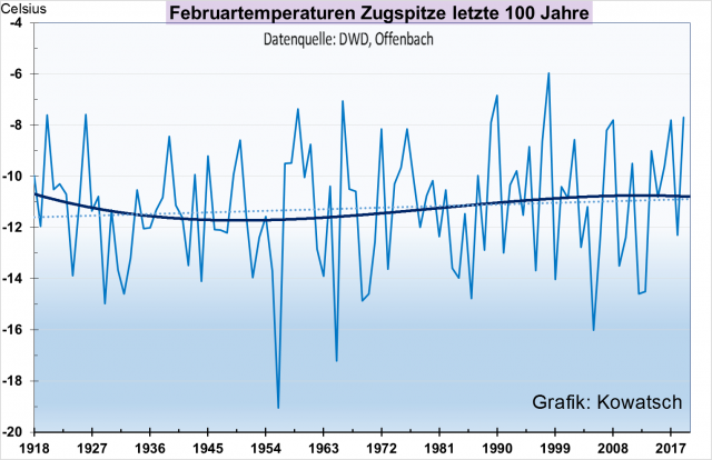Grafik 3: Die Zugspitze, Deutschlands höchster Berg zeigt einen ähnlichen Temperaturverlauf wie die Deutschlandtemperaturen. Allerdings ist das momentane Temperaturplateau nicht so ausgeprägt wie beim DWD-Februarverlauf der letzten 102 Jahre.