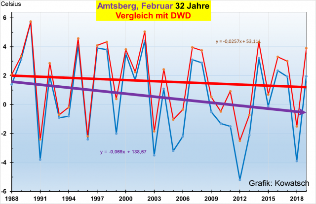 Nichts für ungut, aber ich kann mit solchen Behauptungen wie, „Der Februar zeigt seit über 100 Jahren keine Erwärmung, seit gut 30 Jahren wird er kälter“ nichts anfangen, wenn sich hier eindeutig ein Erwärmungstrend abzeichnet (was btw. nach Ende der kleinen Eiszeit nicht verwundern dürfte):
