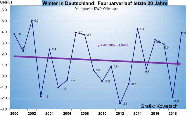 Die Ausgangslage der CO2-Erwärmungskirche: Es sollte immer wärmer geworden sein aufgrund der Zunahme der Treibhausgase, insbesondere von Kohlendioxid, und in den letzten beiden Jahrzehnten sollte der Erwärmungstrend besonders stark sein. Und vor allem die Wintermonate wären die ersten Opfer der Erwärmung, orakelte die gesamte Klimakirche vor 20 Jahren. Deutschland wird keine Winter mehr erleben, verkündete schließlich in messianischem Eifer M. Latif und dieser Klimaclown wird immer noch gut bezahlt und von den Medien hofiert. Im Artikel soll gezeigt werden, dass nichts von all den Behauptungen auf den Monat Februar zutrifft.