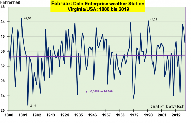 Grafik 8: Die sehr ländliche Virginia Wetterstation zeigt keinerlei Februarerwärmung seit ihrem Bestehen. Es handelt sich um die älteste Wetterstation in Virginia und die drittälteste in den USA. Beachtenswert sind aber die letzten 3 Februarmonate, die deutlich über dem Schnitt der letzten 140 Jahre liegen.