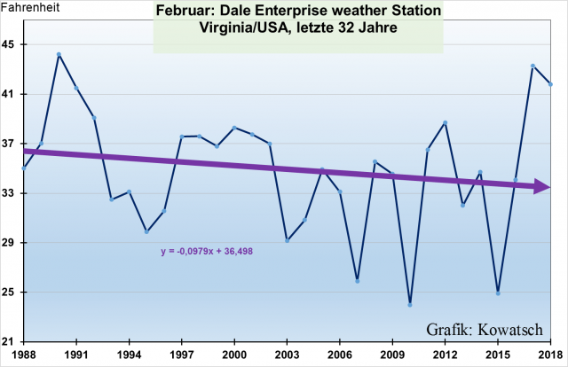 Grafik 9: Die ländliche wärmeinselarme Station in Virginia zeigt die gleichen deutlichen Februarabkühlungen wie ländlichen Wetterstationen bei uns.