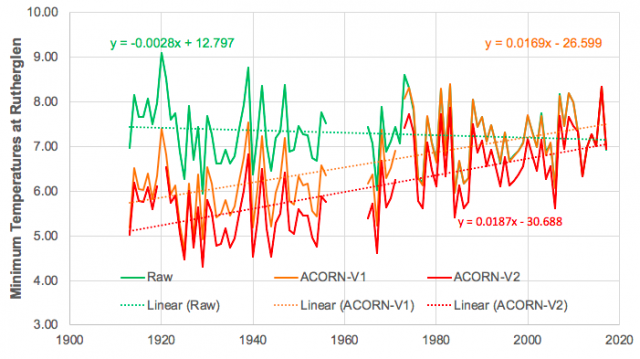 Im Jahre 2014 erklärte Graham Lloyd, Umweltreporter bei The Australian unter Verweis auf mich, wie ein Abkühlungstrend in der Aufzeichnung der Minimum-Temperaturen in Rutherglen in einen Erwärmungstrend umgewandelt worden ist, in dem man die Temperaturen von 1973 bis zurück zum Jahr 1913 sukzessive verändert hat, wobei man die Abwärts-Korrektur um so stärker gehalten hat, je älter die Temperaturreihe ist. Für das Jahr 1913 ergibt sich damit die große Differenz von 1,7°C zwischen der mittleren jährlichen Tiefsttemperatur, wie sie mit der Standard-Instrumentierung an dieser offiziellen Wetterstation gemessen worden ist, und der umgemodelten Version 1 der ACORN-SAT-Temperatur. Das Bureau antwortete Lloyd und behauptete, dass die Änderungen notwendig gewesen seien, weil die Instrumentierung zwischen verschiedenen Koppeln hin und her verlagert worden ist. In dem flachen lokalen Terrain ist das keine logische Erklärung, und außerdem stellt der offizielle ACORN-SAT-Katalog fest, dass die Station niemals an eine andere Stelle verlegt worden ist.