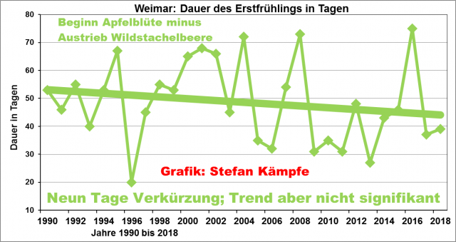 Abb.4: Leichte Verkürzung der Dauer des Erstfrühlings in Weimar von etwa 52 auf 43 Tage seit 1990. Würde man die etwas spätere Forsythienblüte verwenden, käme man zu einem ähnlichen Trend bei geringerer Tageszahl. Der Trend ist wegen der großen Streuung nicht signifikant. Aus diesem Trend darf nicht auf künftige Entwicklungen geschlossen werden. Im aktuellen Jahr 2019 trieb die Stachelbeere in Weimar am 25. Februar aus; mit einer relativ zeitigen Apfelblüte wird gerechnet.