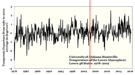 Jemand mit Kontakt zu Attenborough, vorzugsweise jemand, der behauptet, über Klima Bescheid zu wissen, sollte ihm unbedingt den jüngsten Temperaturverlauf der unteren Troposphäre zeigen. Die Daten sind für jedermann verfügbar, der sie unter die Lupe nehmen möchte, so wie es David Archibald jüngst in seinem Artikel [übersetzt] „Klima: Nur falls Sie sich fragen“ [Climate: In Case You Were Wondering] (Abbildung 1). Sie zeigt 41 Jahre lang keinen Temperaturanstieg, also über einen Zeitraum, der die meiste Zeit von Attenboroughs Erwachsenenleben abdeckt und während der er um die Welt reiste, um die Natur zu filmen. Während der ganzen Zeit fuhr der CO2-Gehalt der Atmosphäre fort, stetig zu steigen – vollkommen im Widerspruch zum ursprünglichen Gedanken. Die rote Linie in Abbildung 1 markiert das Jahr 2004, also dasjenige Jahr, in welchem die Schöpfer und Befürworter der großen Lüge versuchten, die Beweise dafür zu ignorieren, dass ihre Theorie falsch war. Der Beweis dafür, dass sie das auch wussten, wird dokumentiert dadurch, dass sie die Bezeichnung ,globale Erwärmung‘ änderten zu ,Klimawandel‘.