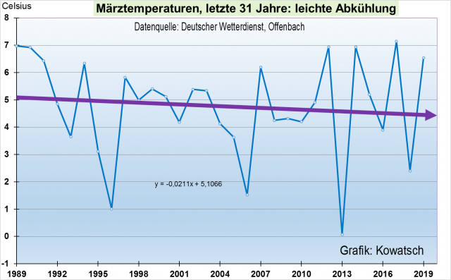 Abb. 1: Der Monat März, gezeichnet nach den Erhebungen des Deutschen Wetterdienstes, zeigt eine leichte, aber nicht signifikante Abkühlung innerhalb der letzten 31 Märzmonate. Der März 2019 war wegen der vielen, trüben, frostfreien, windigen Westwetter-Nächte relativ mild und liegt deutlich über der fallenden Trendlinie, ein Ausgleich zum letzten Jahr. Der CO2-Anteil der Luft in Deutschland steigt, die Märztemperaturen nicht. Allein das ist schon ein Beweis, dass CO2 gar keine oder nur eine minimale Erwärmungswirkung haben kann.
