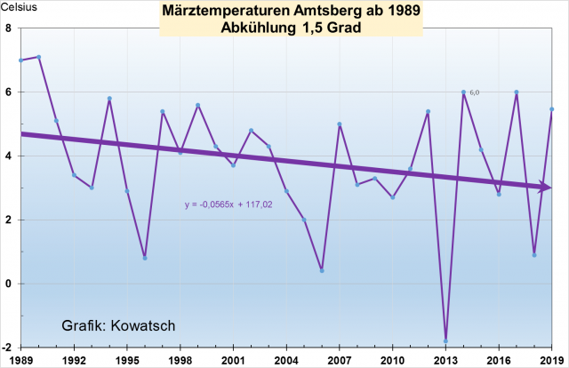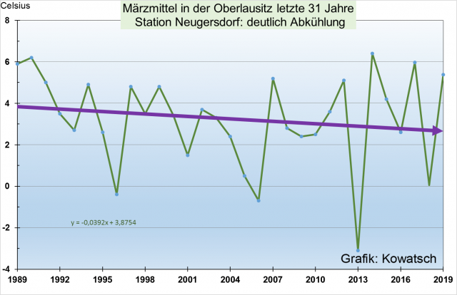 Abb.2: Der März wurde auf dem Lande im Erzgebirge laut Trendlinie seit 1989 um 1,5 Grad kälter. Die deutliche Abkühlung ist das Gegenteil einer Klimaerwärmung. Der diesjährige März lag auch im Erzgebirge deutlich über der fallenden Trendlinie.