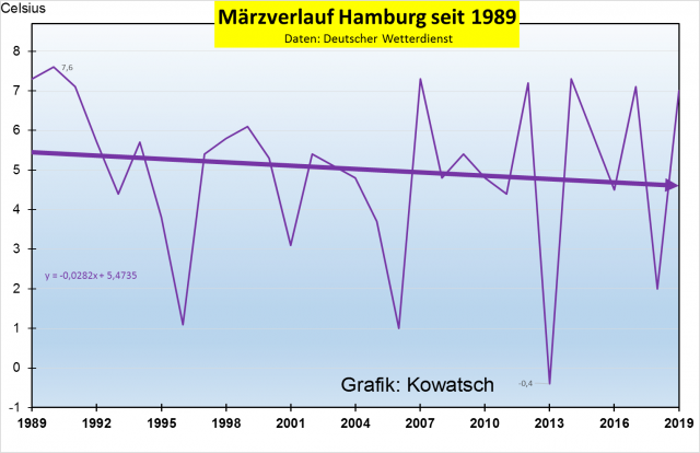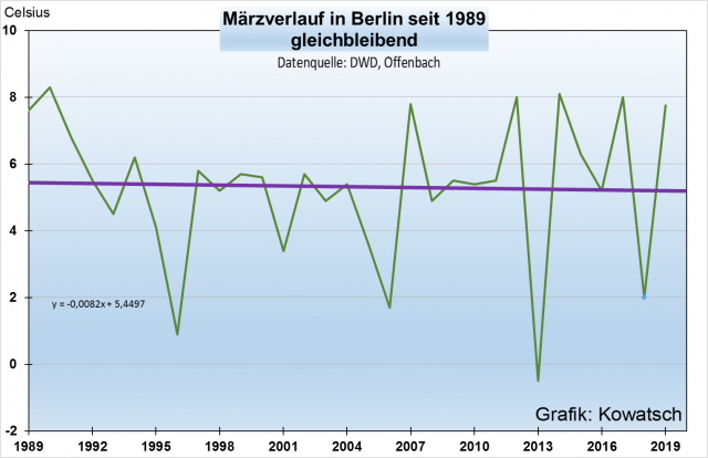 Zunächst fragen wir uns, wo dieser 2019-er März innerhalb der letzten 30 Jahre einzuordnen ist. Die Antwort gibt die Grafik 1, gezeichnet nach den Archiv-Angaben des DWD und vom DWD ermittelt aus 1900 Wetterstationen. Leider fehlt diese Grafik im Artikel des DWD über den März, denn sie zeigt, dass es seit gut drei Jahrzehnten keine Erwärmung gibt. Im Gegenteil. Der März wird deutschlandweit seit 1989 eher kälter.