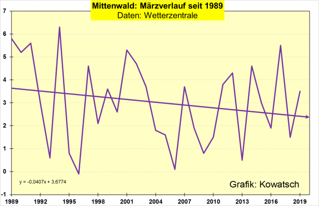 März bei ländlichen Stationen im Süden: Mittenwald. Die DWD-Station befindet sich in den Buckelwiesen bei einem Almbauern auf nahezu 1000 m Höhe.
