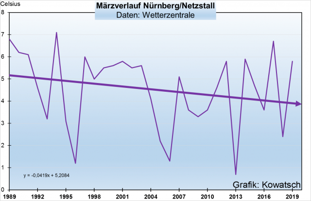 Die grundsätzliche März-Klima-Abkühlung in Deutschland wurde hauptsächlich von häufigeren, kalten Großwetterlagen verursacht. Wie es weitergeht weiß niemand, denn der weiter anhaltende CO2-Ausstoß hat keine oder fast keine erwärmende Wirkung.