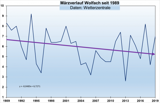 DWD-Wetterstation Wolfach im Südschwarzwald, Kinzigtal, 290 m Meereshöhe. Die Wetterstation liegt seit 15 Jahren außerhalb von Wolfach. Laut DWD haben Stationsverlegungen innerhalb einer kurzen Distanz keine Auswirkungen auf die Erfassung. In unmittelbarer Nähe führt die neue Umgehungsstraße vorbei. Man beachte den Trend.